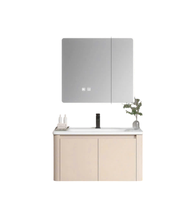 Bộ tủ chậu Lavabo màu kem gương LED bo góc – tủ lavabo cao cấp thiết kế tối giản, mang đến vẻ đẹp thanh lịch và hiện đại cho không gian phòng tắm. Sản phẩm nổi bật với tông màu kem (nude) thời thượng, giúp không gian trở nên sáng sủa, nhẹ nhàng và dễ phối nội thất. Bộ tủ chậu Lavabo màu kem gương LED bo góc là lựa chọn lý tưởng cho các căn hộ, villa theo phong cách tối giản hoặc Wabi-sabi.