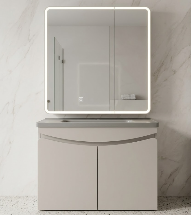 Tủ dưới kiểu dáng cách điệu với cánh tủ bo cong tinh tế, tạo điểm nhấn mềm mại. Gương LED bo góc hiện đại tích hợp đèn cảm ứng, mang lại ánh sáng dịu nhẹ và tăng chiều sâu cho không gian.
