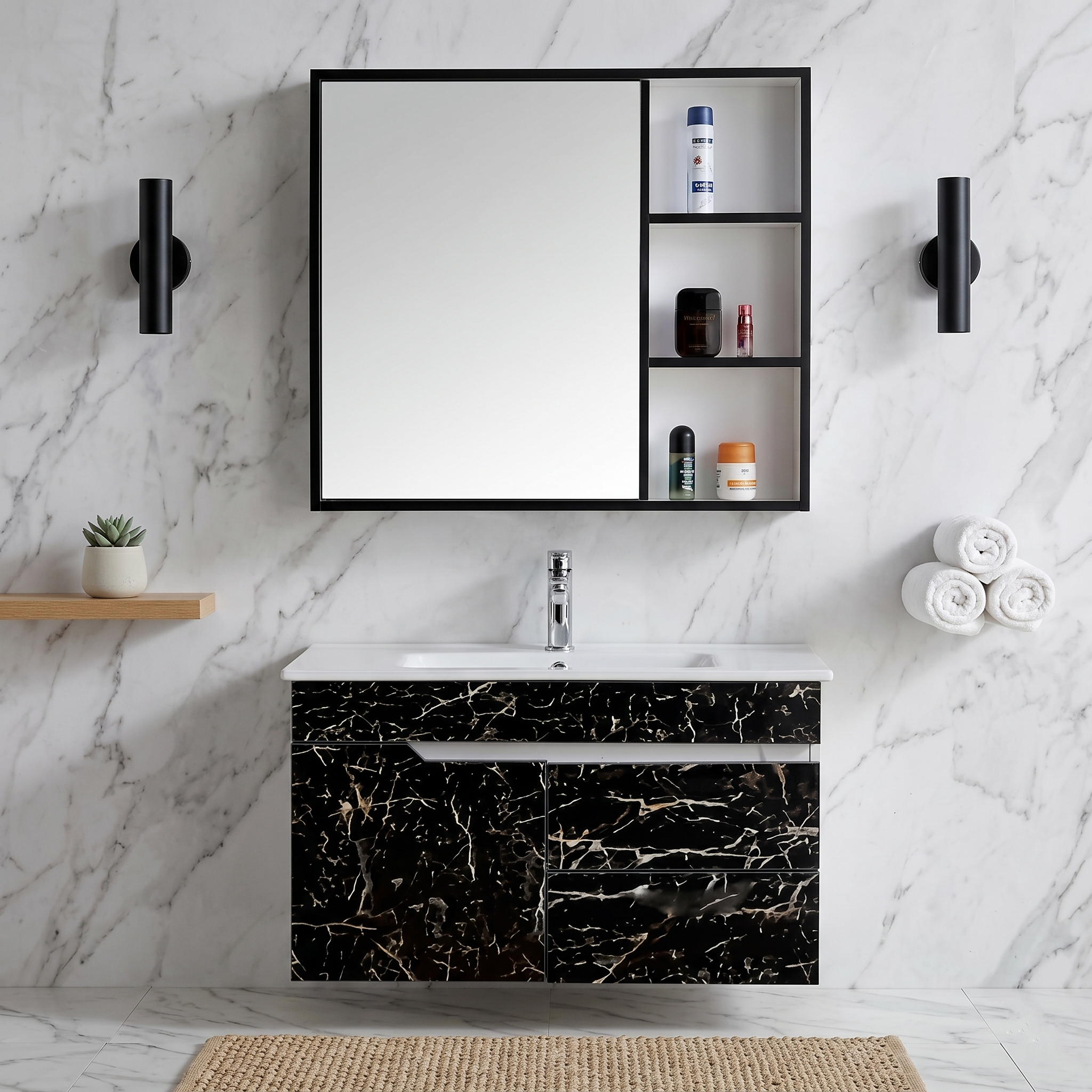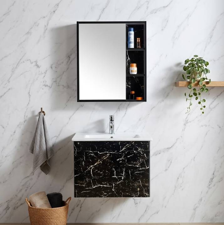 - Ngăn kéo vân đá sang trọng: Điểm nhấn lớn nhất là ngăn kéo chính với bề mặt vân đá trắng tinh tế, kết hợp tay nắm đen tròn độc đáo, tạo vẻ đẹp cao cấp như phòng tắm hạng sang.